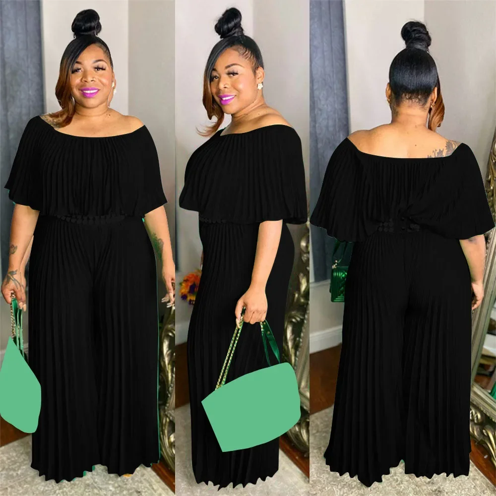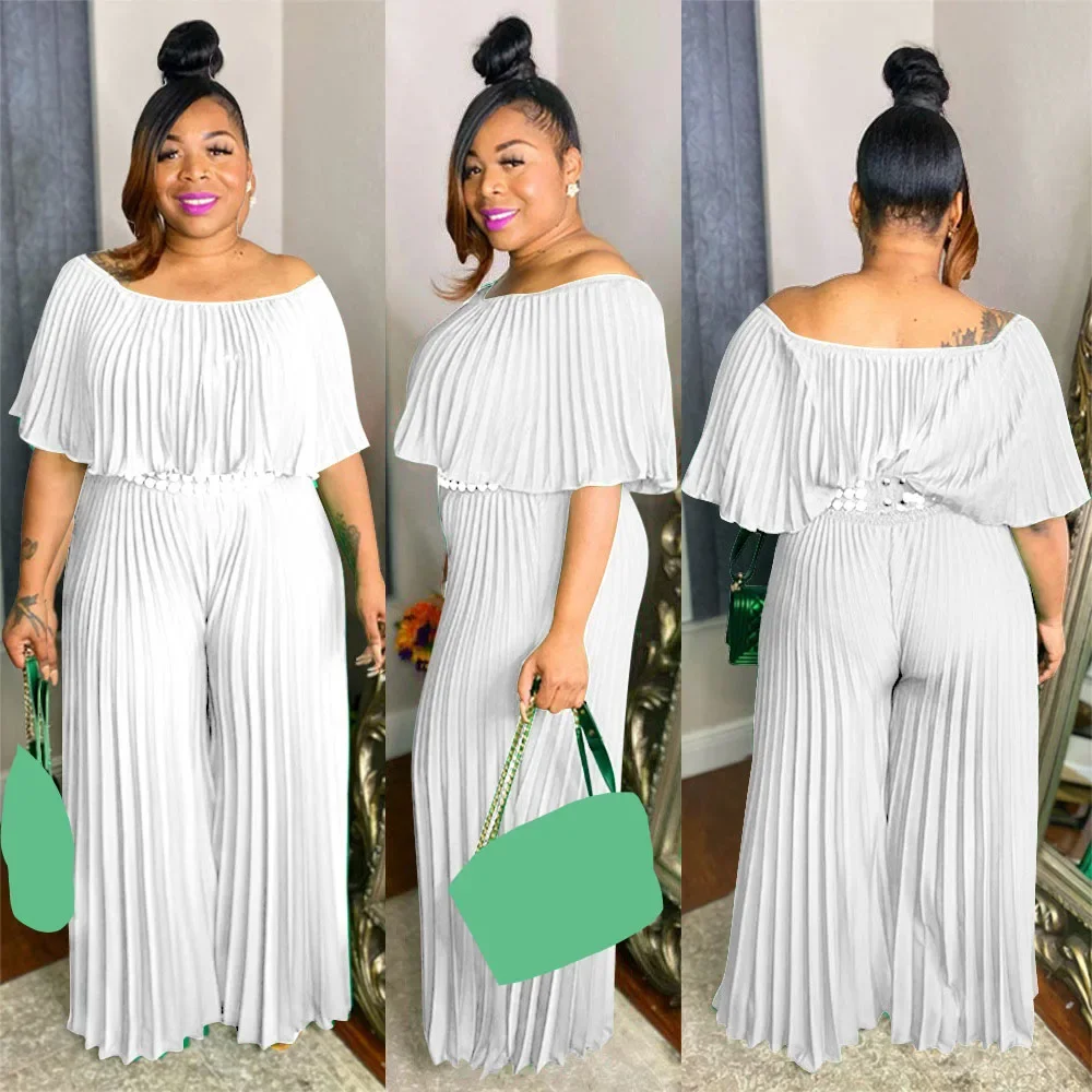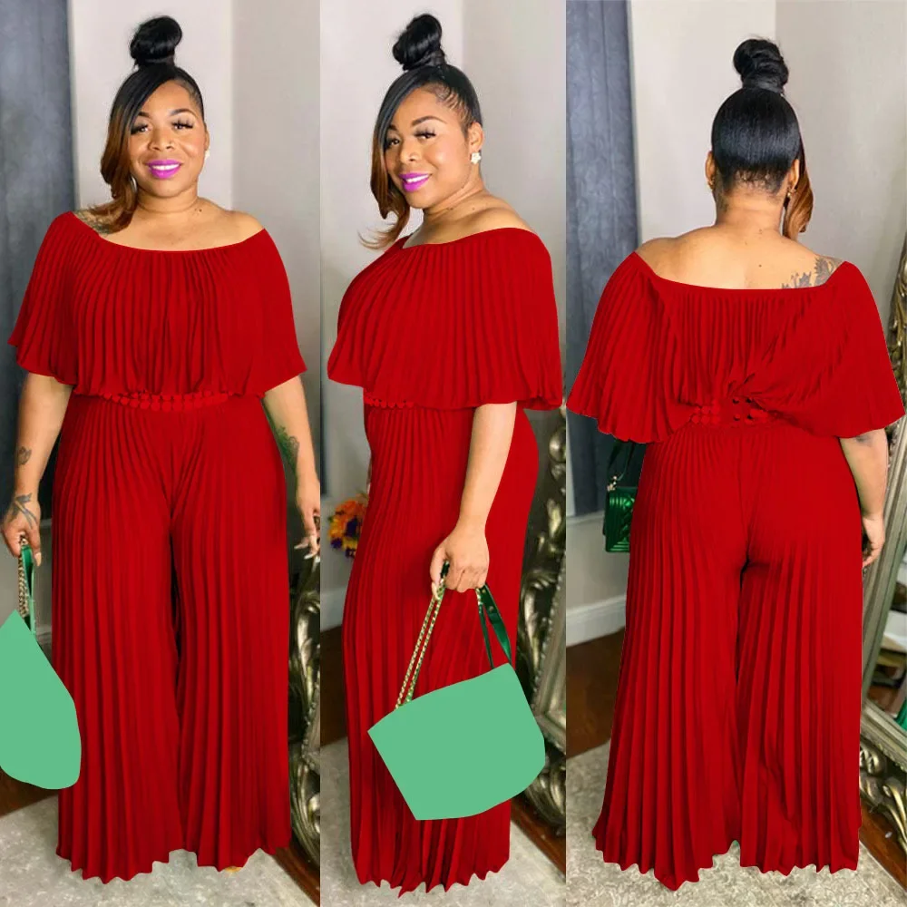 KEXU Pleated Women Plus Size Jumpsuit Ruffless Sexy One Shoulder Slash Neck Loose Wide Leg Pants Fashion Summer Overalls
